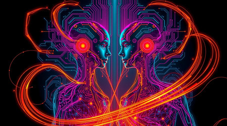 Neon cyborgs and human heads. Artificial intelligence concept.