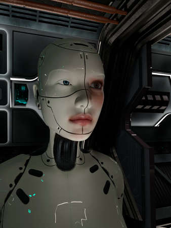 Cyborg woman in futuristic space corridor - 3d rendering