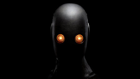 Robot head with glowing orange light on black background. 3d illustration