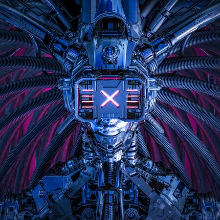 Neon composition. Hybrid human head revealing mechanical structure in retro-futuristic space. Concept of implants, prosthetics, cyber anatomy, body modification and emotional identity research.