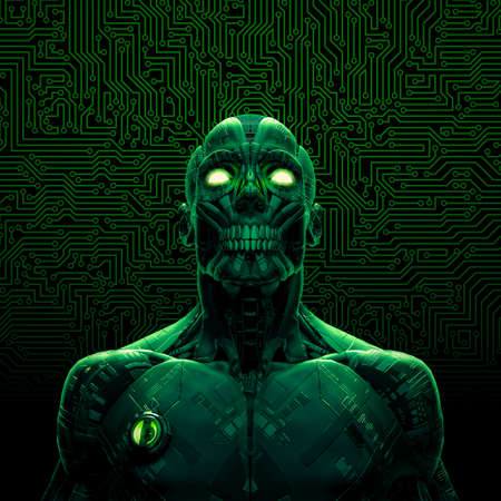 Zombie cyborg artificial intelligence - 3D illustration of dark green humanoid alien robot with computer circuit board background
