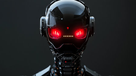 God-like AI, superintelligent artificial intelligence that learns and develops autonomously. Ai godlike could be a threat and destroy human race. A robot with red eyes turns and looks at you.