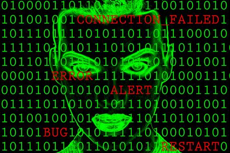 A common man trapped in the modern digital world. Frustrated stressed senior man holding his head behind background from a binary code. Digitization and e-gov concept.
