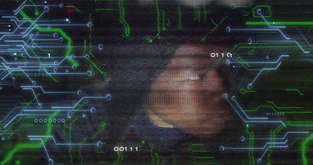 Image of binary code, integrated circuit and face of african american hacker. Global data safety, hackers attack and technology concept digitally generated image.