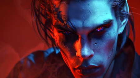 A male vampire with glowing red eyes stares intensely. The background is bathed in contrasting red and blue light. Concept of horror, supernatural, and gothic design.