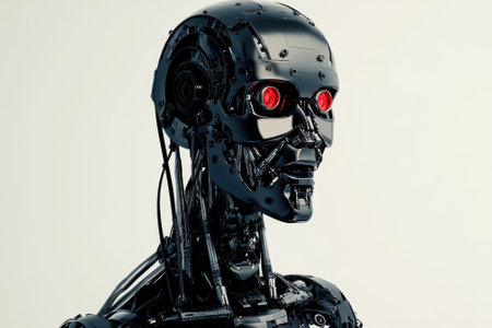 Full-body robotic figure with red accents and metallic structure. Robot with an imposing stance. Concept of robotics dominance, advanced Artificial intelligence design, mechanical innovation