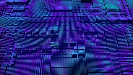 Virtual circuit of connections in motherboard. Animation. Luminous dots move schematically in computer space. Field of computer connections in motherboard circuit