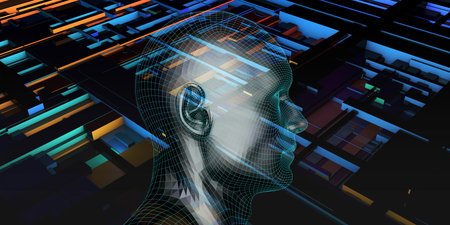 Displaying circuit head silhouette hovering in holographic panel, with grid lines and code snippets. Futuristic, technology, digital, holographic, abstract, data visualization, cyber
