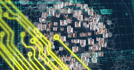 Forming human head silhouette with headshot thumbnails on digital network grid, with neon circuitry. Technology, innovation, artificial intelligence, cyber, futuristic, data analytics, connectivity