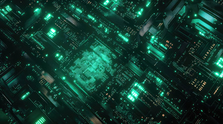 Circuit board futuristic server code processing. Orange, green, blue technology background with bokeh. 3d Illustration