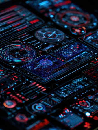 A captivating futuristic digital dashboard showcasing glowing interfaces and high-tech elements ideal for themes of data analysis, cybersecurity, and technological advancements.