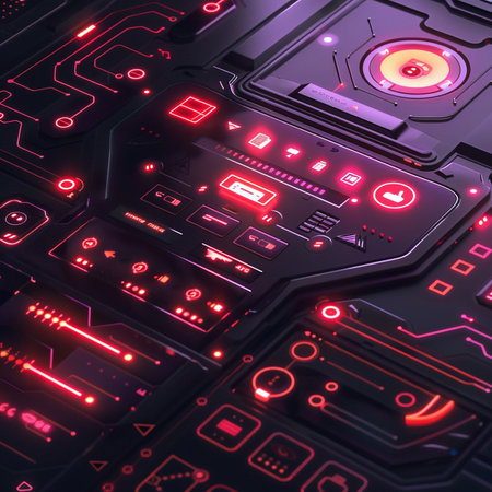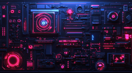 Explore a stunning futuristic technology panel featuring intricate circuits and vibrant red neon lights, perfect for sci-fi themes and modern design projects.