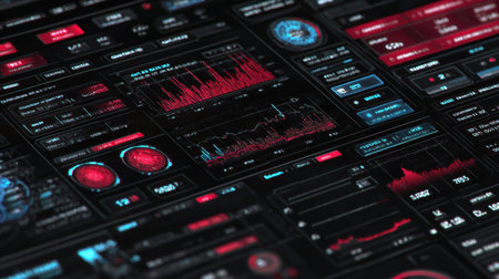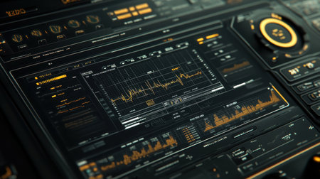 Intricate digital interface featuring bright screens with various graphs, charts, and data visualizations set against a dark background