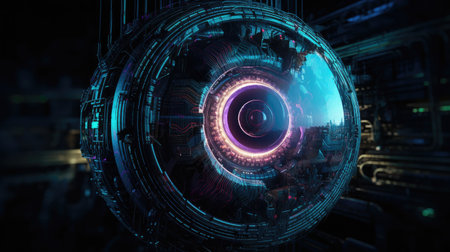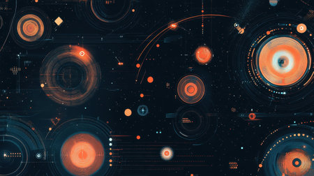Explore a captivating futuristic design featuring intricate glowing circular shapes set against a dark background, perfect for showcasing technological themes and innovations.