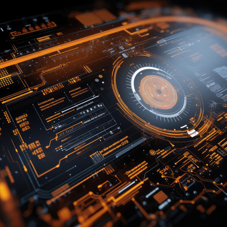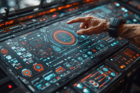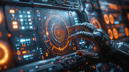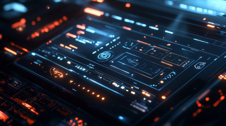 Futuristic control panel with a glowing orange holographic interface, showcasing advanced technology, data analysis.