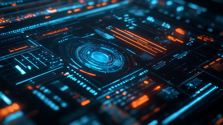 Explore a captivating futuristic digital interface showcasing glowing elements in blue and orange, ideal for technology, science, and abstract design applications.