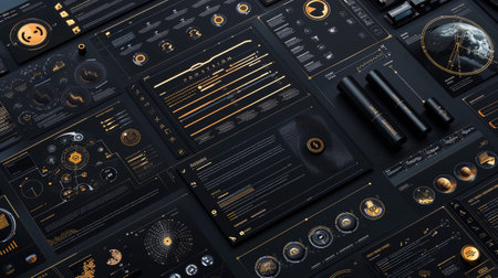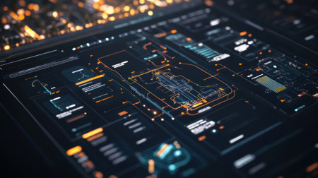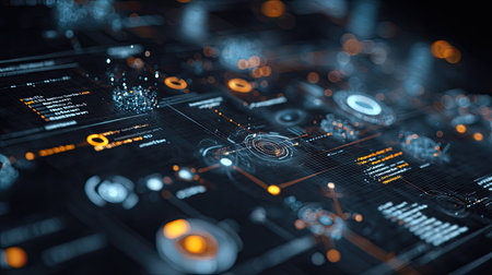 Explore a high-tech user interface featuring a digital dashboard with various metrics and analytics. Perfect for technology themes and futuristic concepts.