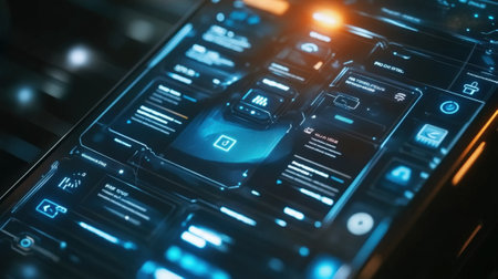 Close-up view of a futuristic technology interface with holographic display panels and illuminated digital controls.