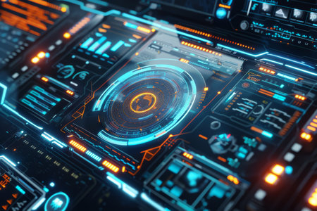 A high-tech interface featuring vibrant glowing elements and abstract patterns, perfect for themes of digital technology, data visualization, and futuristic design concepts.