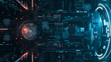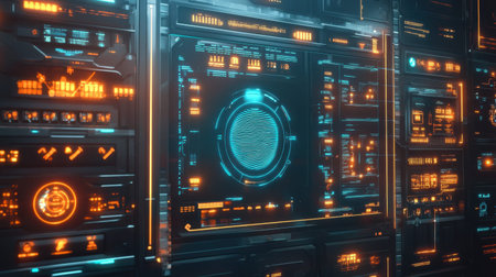 Explore a sophisticated futuristic interface featuring intricate data analysis panels and control modules, perfect for high-tech environments. This design showcases advanced digital elements, ideal for technology-oriented projects.