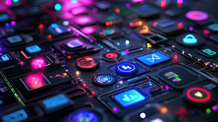 Explore this vibrant and futuristic digital interface filled with colorful icons and apps. Perfect for showcasing technology, innovation, and modern design themes.
