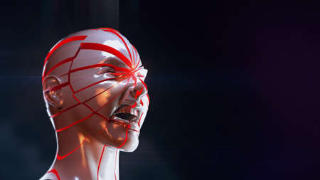 Glossy woman head exploding shuttered - Headache, psycho mental problems, split personality stress, disaster concept illustration. 3d render,