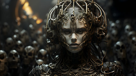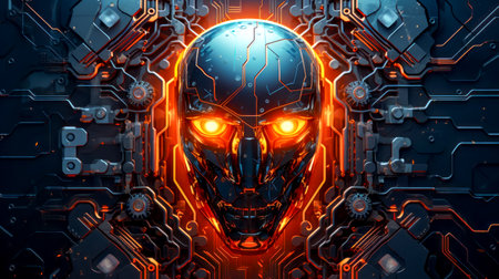 Technology background featuring a robotic face with digital patterns and cybernetic enhancements. Generative