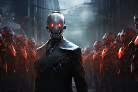 background with an army of advanced robots, technologies, representing artificial intelligence, programming and robotics. Generative AI
