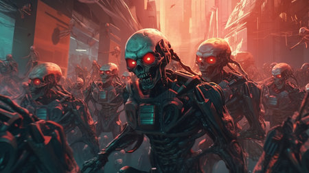Ominous Robot red eyes. Face skull metal. Generate Ai