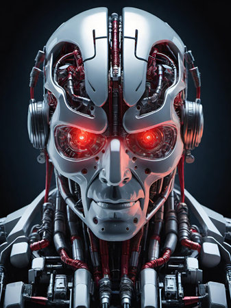 Menacing Cybernetic Robot with Red Eyes in Dark Setting
