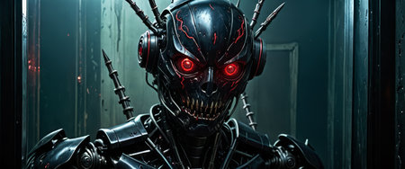 An ominous front-facing portrait of a robot with piercing red eyes. The chilling effect is amplified by the dark background, highlighting the stark features of the mechanical being.