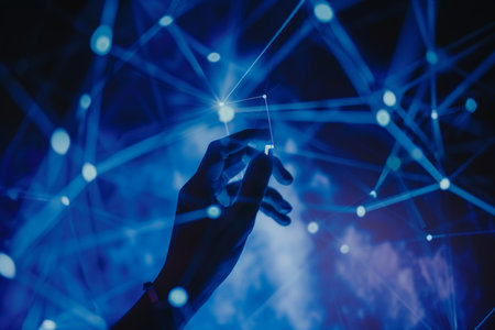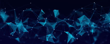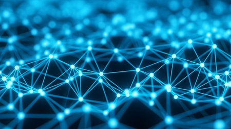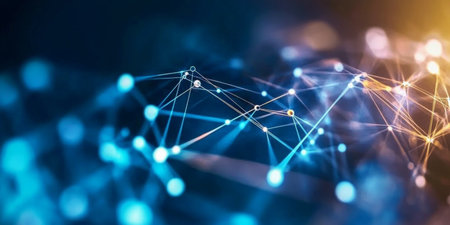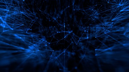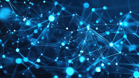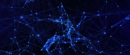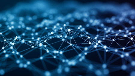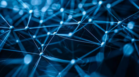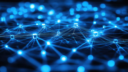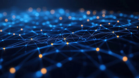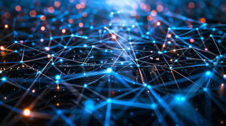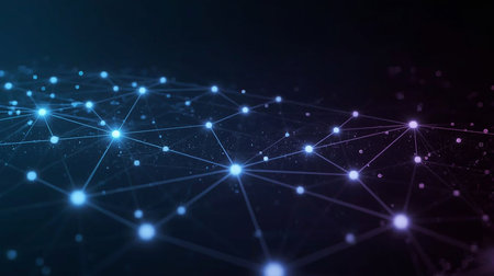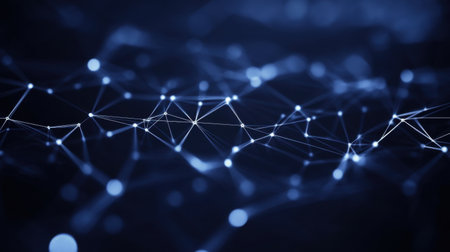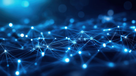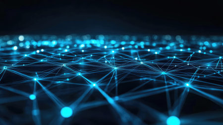 A network of glowing blue nodes and lines creates an intricate abstract pattern against a dark background,...
