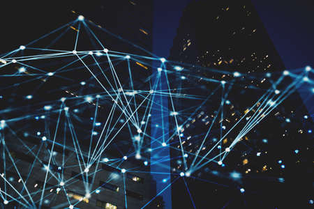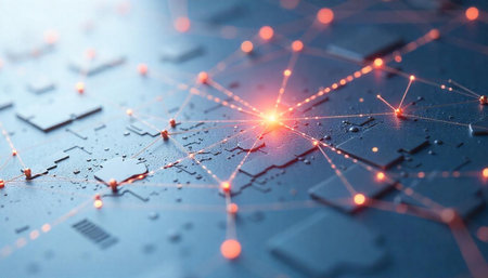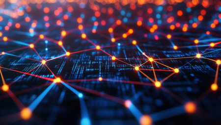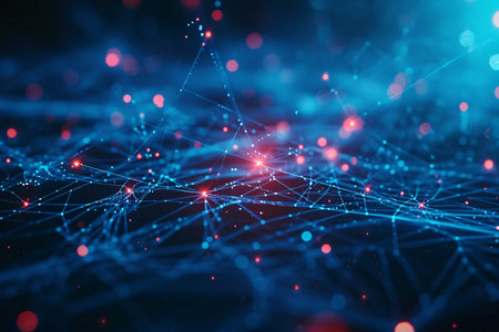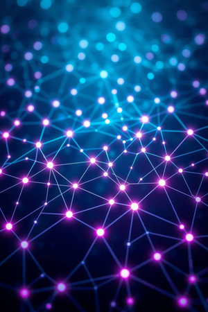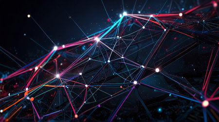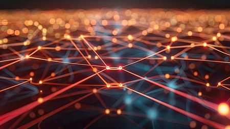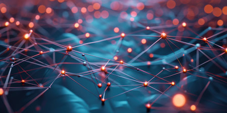 This abstract illustration showcases a dynamic digital network with glowing nodes and connecting lines that suggest a sense of technology and connectivity.