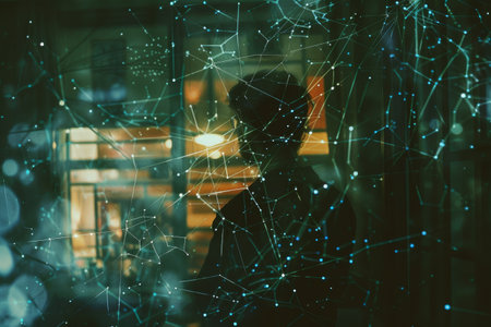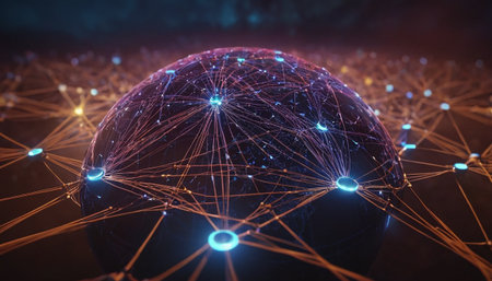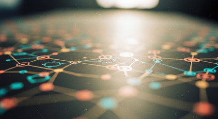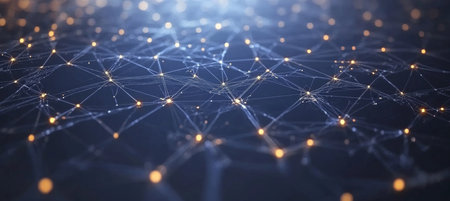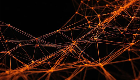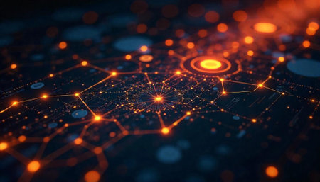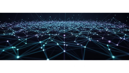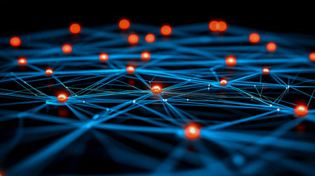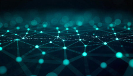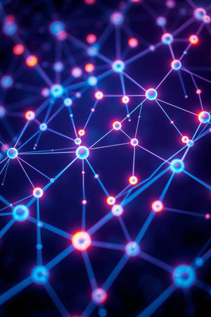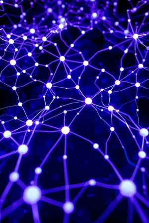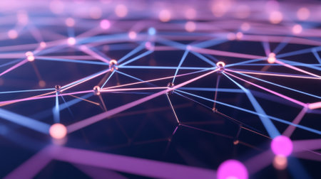 This image depicts an abstract representation of interconnected networks. It features a complex web of nodes and lines against a dark background, illustrating the intricate relationships and pathways within a digital or technological framework. The nodes are illuminated with a soft glow, highlighting the importance of each connection in the overall structure.