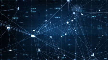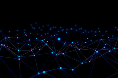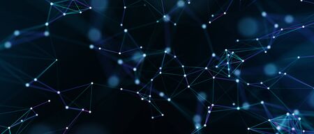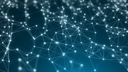 Digital blockchain concept and data transfer system. Network connection structure. Abstract background with moving dots and lines. Futuristic illustration. 3d rendering.
