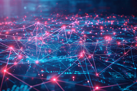 This digital artwork illustrates a dynamic network of glowing nodes connected by luminous lines, representing technological advancement and data flow in a vibrant environment.