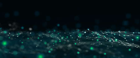 Abstract green futuristic technology big data digital background. Network connection structure and Low poly shape wireframe particle wave. Polygon abstract background. 3D Render.