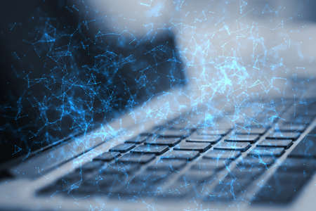 Close up of laptop with blue polygonal mesh. Technology, security and web hacking concept. double exposure
