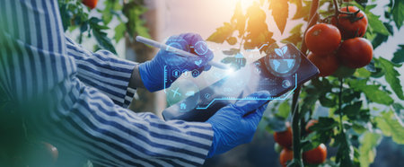 Farmer inspecting tomatoes and using tablet computer for analysis. Agriculture innovative technology concept