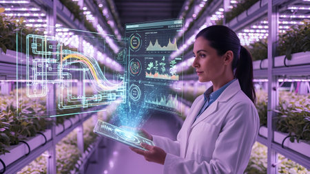 Female scientist analyzing smart farm data with holographic interface for optimal plant growth