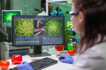 Examining researcher wearing lab coat and gloves inspecting tomato leaf in greenhouse, data overlay. Botany, agriculture, scientific, futuristic, experimental, lush, innovation
