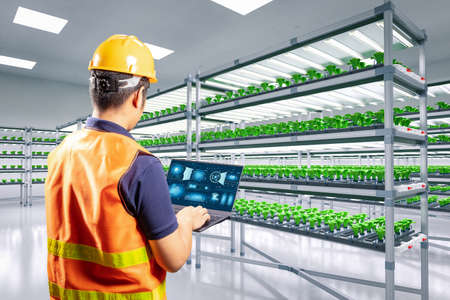 Agriculture technology with worker in smart indoor farm system raised plants on shelves growth with led light