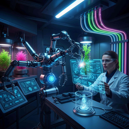 A scientist monitors advanced plant cultivation in a futuristic lab with holographic interface