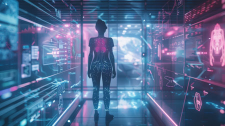 A 3D representation of a human body engulfed by cutting-edge technological devices and equipment, Futuristic anatomy of cyborg with internal view, AI Generated