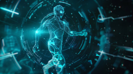 Futuristic interface showing running human body wireframe model