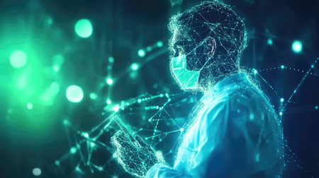 A glowing high-tech medical concept with green and blue light particles in dynamic motion.
