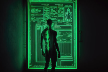 Scanner that scans person's insides (X-ray) of a body that are shown on large green LED screen. Generative AI