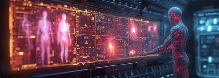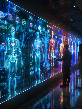 A medical researcher examines detailed holographic human anatomy in a modern laboratory environment.