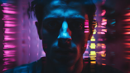Portrait of a young man with neon lights on his face.