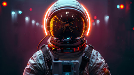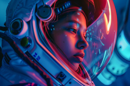 Close-up portrait of a female astronaut wearing a helmet and spacesuit on a spacecraft with neon lighting.